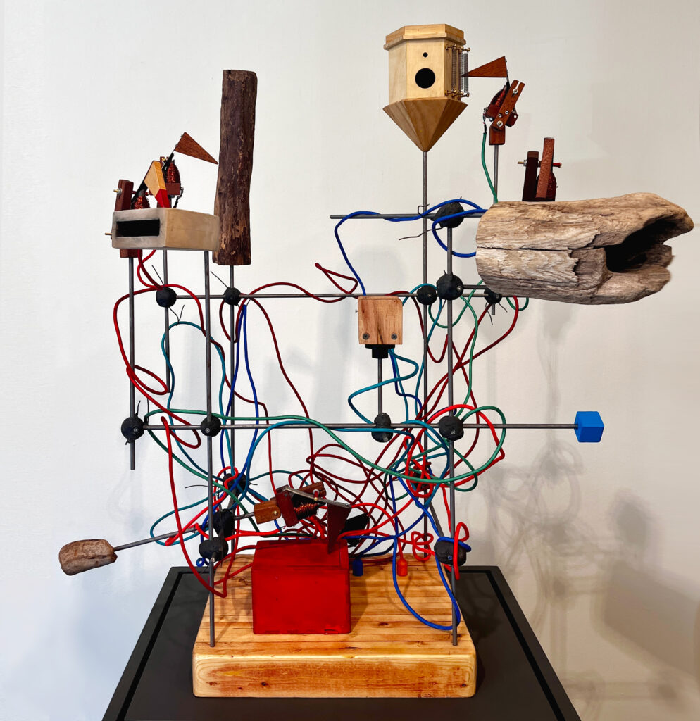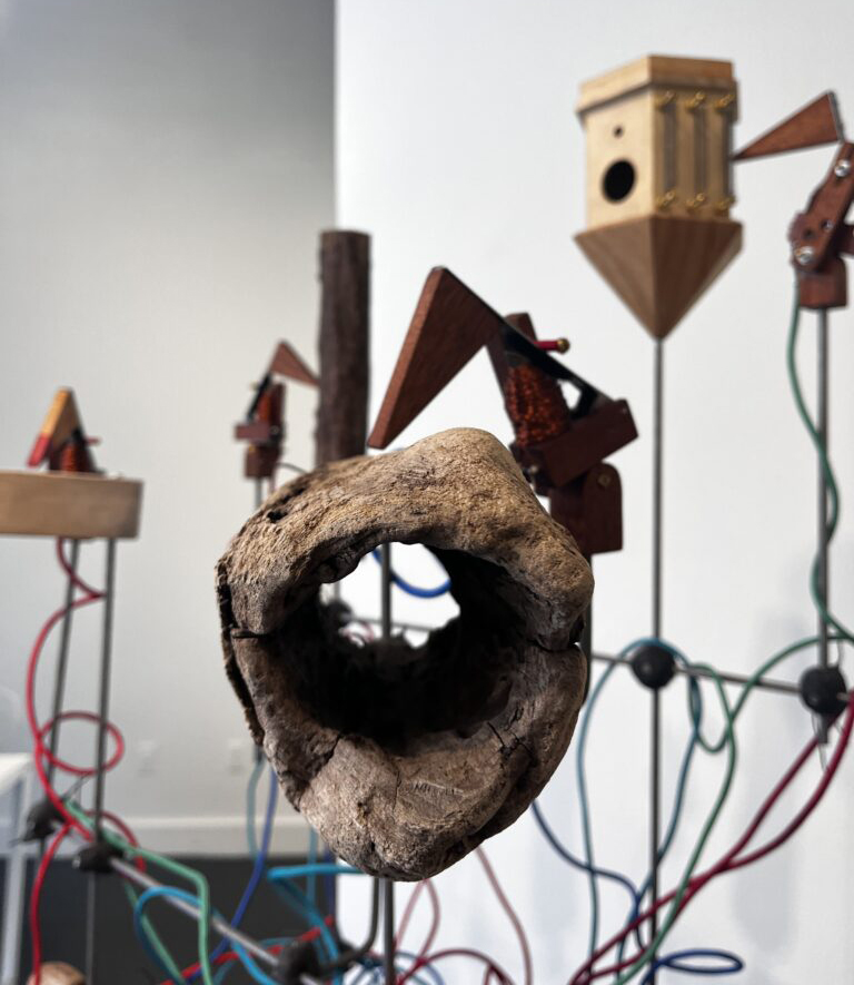 Drum, Warble, Hum, Buzz, Trill, 2023, Wood, metal, plastic, cloth, plaster, resin, paper clay, cotton paper, magnets, electronics, sound, approximately 4′ x 8′ x 4′